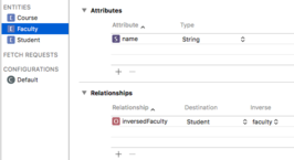 For example, we can see that the above student class has a faculty class, so we create a one to one relationship under entity Student called faculty. Select its destination to Faculty and leave inverse empty for now. Now switch to Faculty entity, go to the relationship, create a new relationship, set its destination back to Student, and select its inverse to the one we previously created faculty. Now go back to student entity, and you can see an inverse relationship has been linked automatically to the one you created in faculty entity