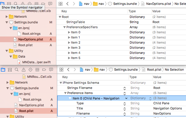First, create a new plist file. First, select the root folder and choose new file from the menu, select property list and create. After creating the new property file, drag it into the settings bundle in the navigation panel and the file will be copied into the settings bundle. Remove the one that you created in the root project folder, and move it into trash.