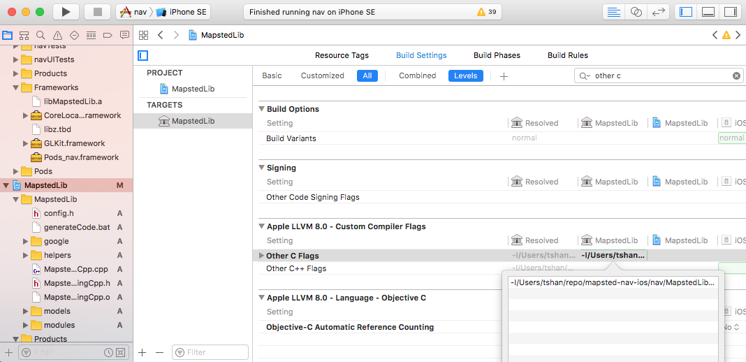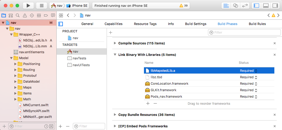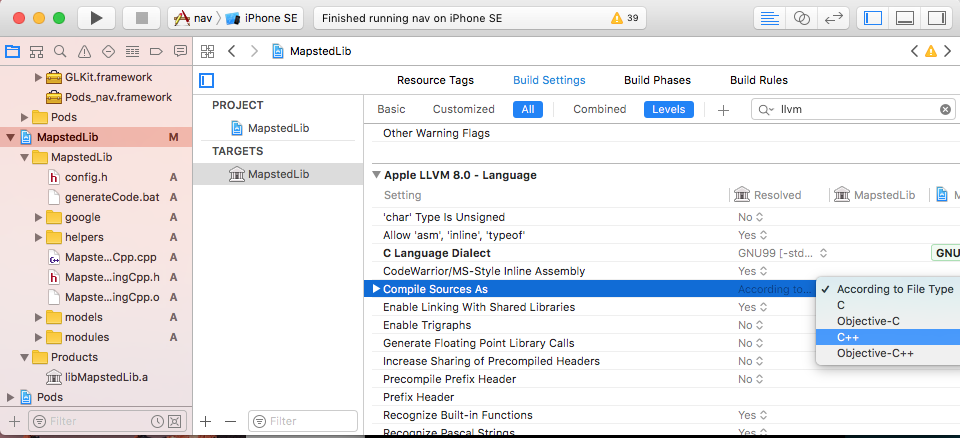 Choose the project folder and open in finder, copy all the c++ source code over. In Xcode File -> Add Files to ..., add everything into the project. Build and run. If everything works fine, it will compile success and create the .a library under the project folder in project navigator.