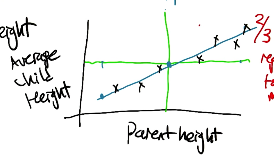 Think about having parent height and their child height. The x-axis being parent height, the y-axis being child height. The green line their is average child height and average parent height. The taller parent has child taller than average and shorter parents having child shorter than average. Back in 1800s regression means collapsing backward towards the mean. But it is different nowadays.