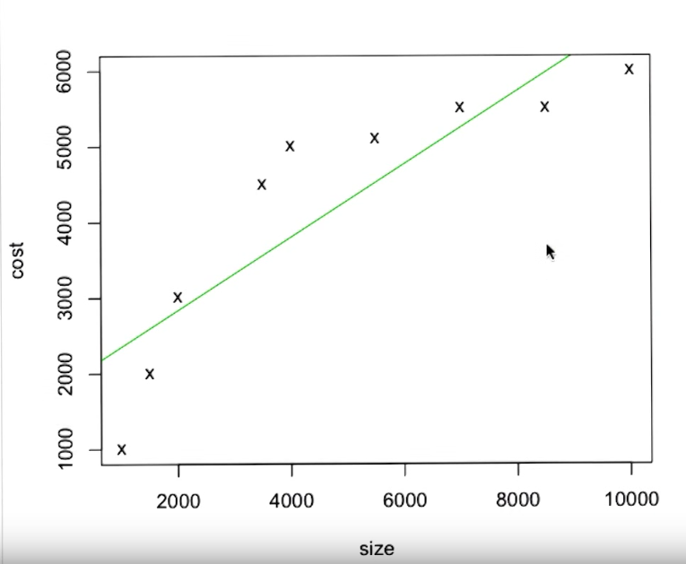 Here I have a graph, with x-axis being size of the house, y-axis being the price of the house. Now we have a collection of data (points on graph) and we want to find a line (equation) where minimize the corresponding deviations (errors). Corresponding deviations means the data collection point to the point on the line (green line).