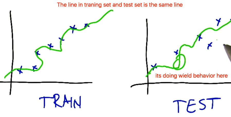 Usually we have a set of training set and a set of test set. First we want to draw the line in the training set, and we draw the line (linear k=1) and the line doesn’t fit properly so we might want to try a higher order of polynomial. Now if we try a higher order of polynomial it definitely hit the point much better, but when we try that line on test set, it is possible that it is doing wield behavior like below.