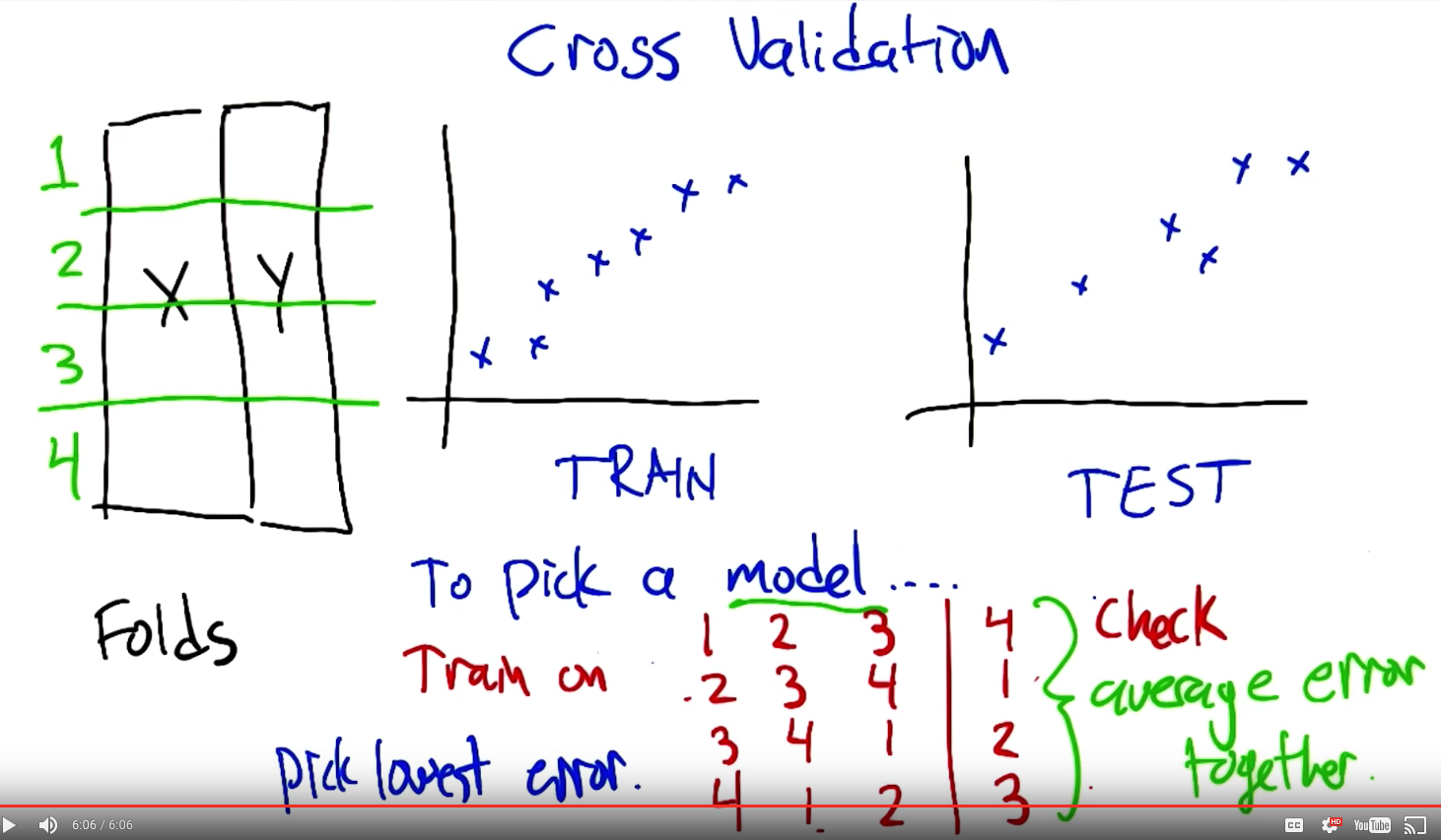 We are going to divide the training data into Folds. We will pick a model first. What we can do is to train on 1, 2, 3 and try on 4, then train on 2, 3, 4 try on 1, then train on 3, 4, 1 and train on 2, etc. Then average all the error together and see how we done. The model that with the lowest average error is the one we are going to use.
