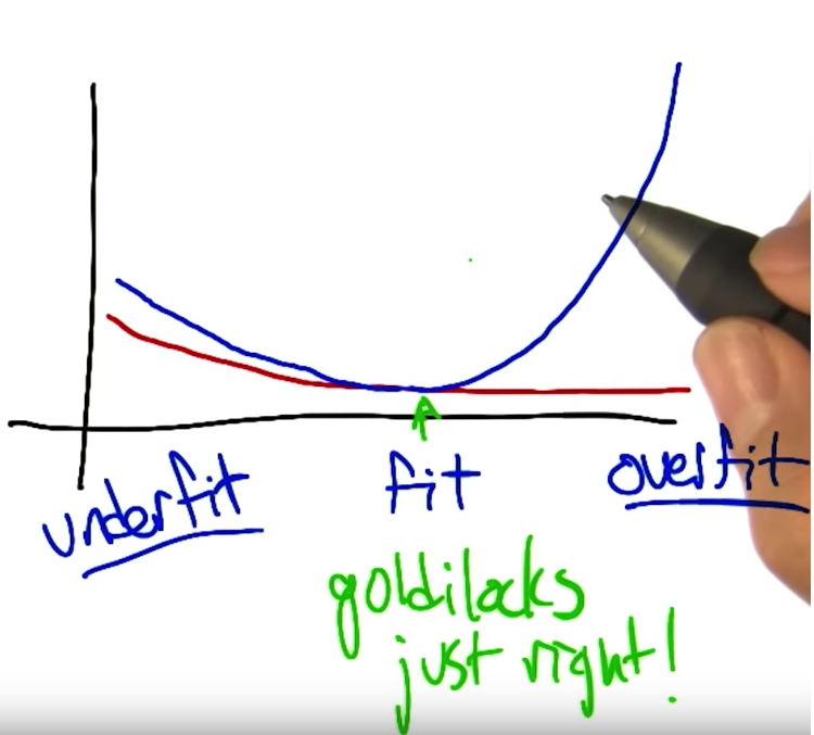 Now lets look at the cross validation error. (green line). At first, you are underfit the data, and as the line goes close and close to polynomial 4, it fits better. After polynomial order 4, you can see the line is overfit the data. The error starts increasing. And the point that it just fit is called the Goldilocks zone. That's the point you really want to find.