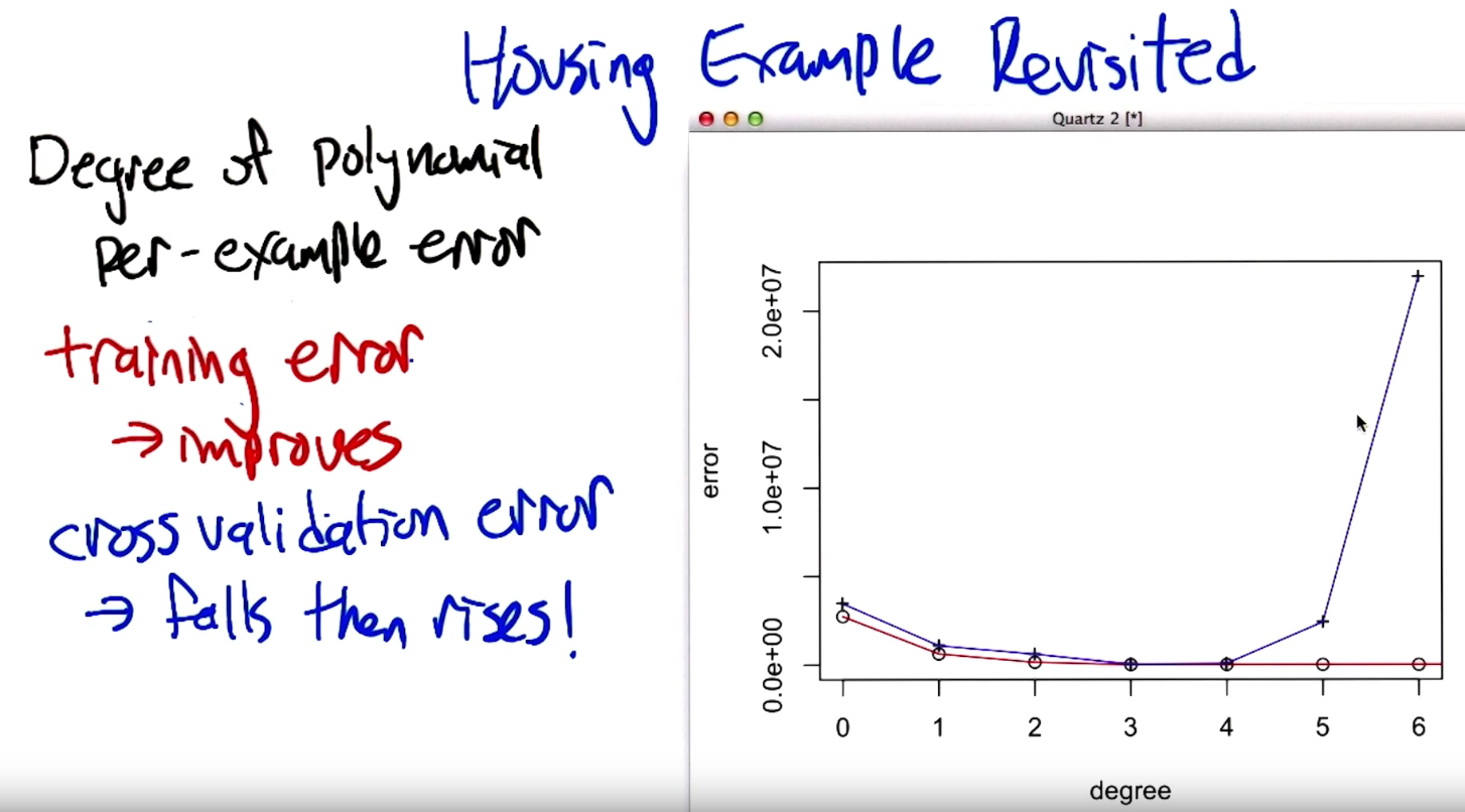 Again, in the housing example, if we look at the degree of polynomial that fits the data, here is a training error graph. Look at the normal training error, (red plot) you can see it is always falling and it becomes smaller and smaller when having more degrees.